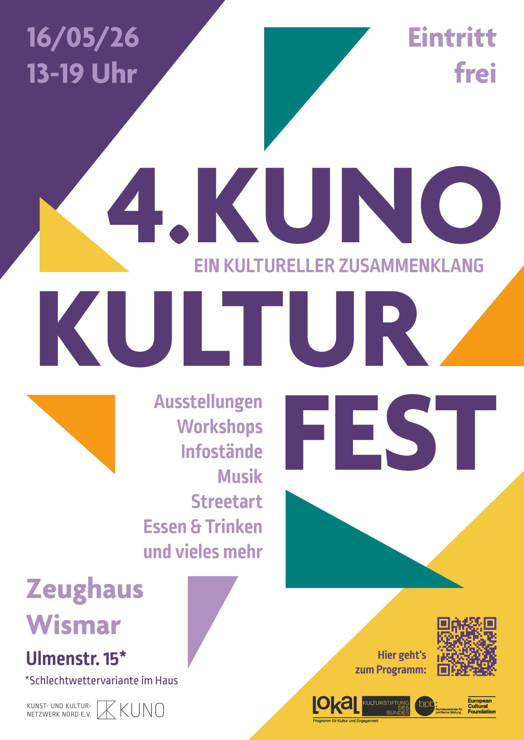In der Zeit von 13:00 bis 19:00 Uhr verwandelt KuNo das Wismarer Zeughaus inklusive Hofareal wieder in eine lebendige, vielfältig-bunte Bühne für die breite Öffentlichkeit. Es gibt ein abwechslungsreiches Programm aus Aktionen, Ausstellungen, Konzerten, Lesungen, Mitmachangeboten, Performances, Workshops und Gastronomie zum Staunen, Ausprobieren, Genießen, Erwerben und Informieren.